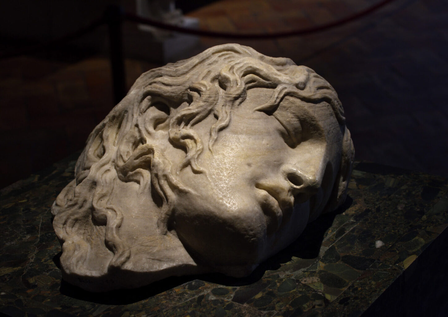 La misteriosa testa marmorea dormiente di Palazzo Altemps, nota come Erinni Ludovisi, è stata recentemente interpretata come la copia romana della testa di un’Amazzone ferita appartenente a un gruppo statuario pergameno.