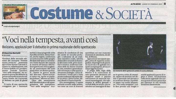 Recensione del critico Massimo Bertoldi sullo spettacolo VOCI NELLA TEMPESTA della compagnia Teatrincorso per il quotidiano Alto Adige. Debutto nazionale nella Stagione (Altri Percorsi) del Teatro Stabile di Bolzano – 20 febbraio 2015.
