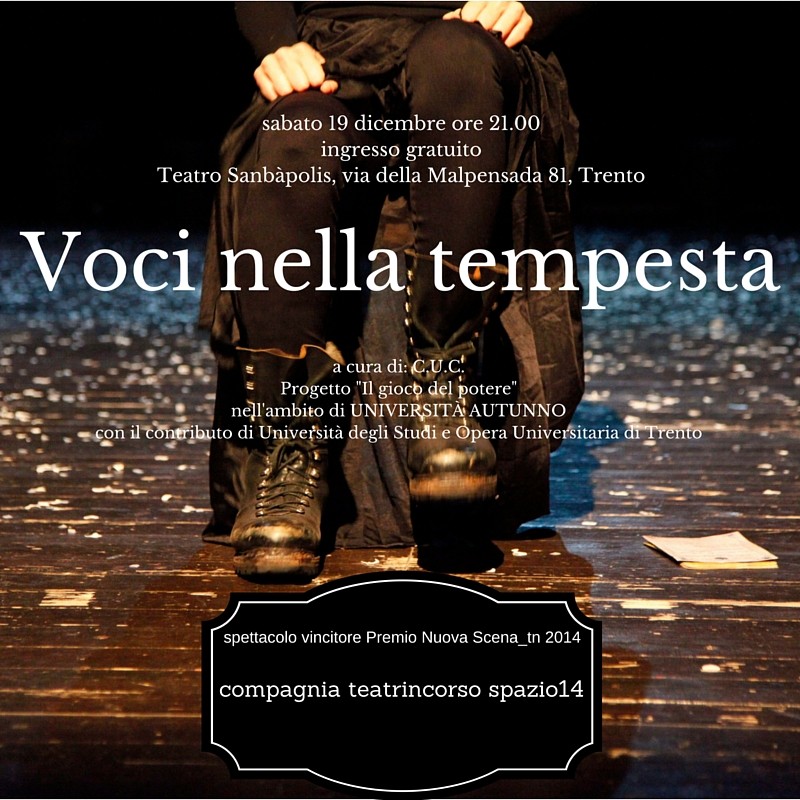Sabato 19 dicembre ore 21.00 presso il Teatro Sanbàpolis di Trento (via della Malpensada, 82 a Trento) si può assistere allo spettacolo “VOCI NELLA TEMPESTA” – Compagnia Teatrincorso (vd. info spettacolo), di ritorno dal clamoroso successo a Vienna e vincitore del Premio Nuova Scena 2014, un’intensa rievocazione di un episodio poco conosciuto della storia Trentina che assume valenze universali e attuali a proposito del tema della guerra e dell’esodo forzato. Organizzazione: C.U.C. (Circolo Universitario Culturale di Trento) con il contributo di Università degli Studi e Opera Universitaria di Trento, Progetto “Il gioco del potere” nell’ambito “Università autunno”.